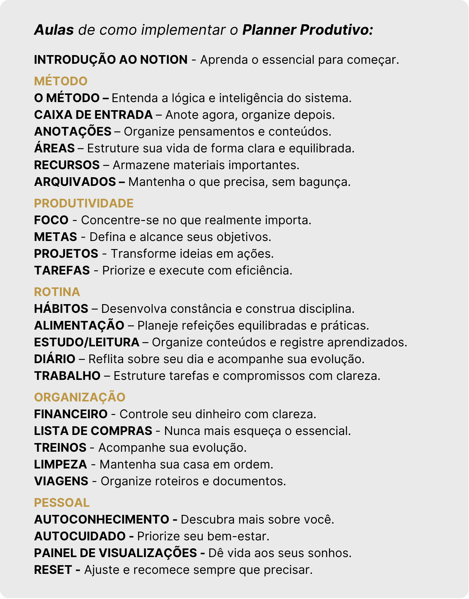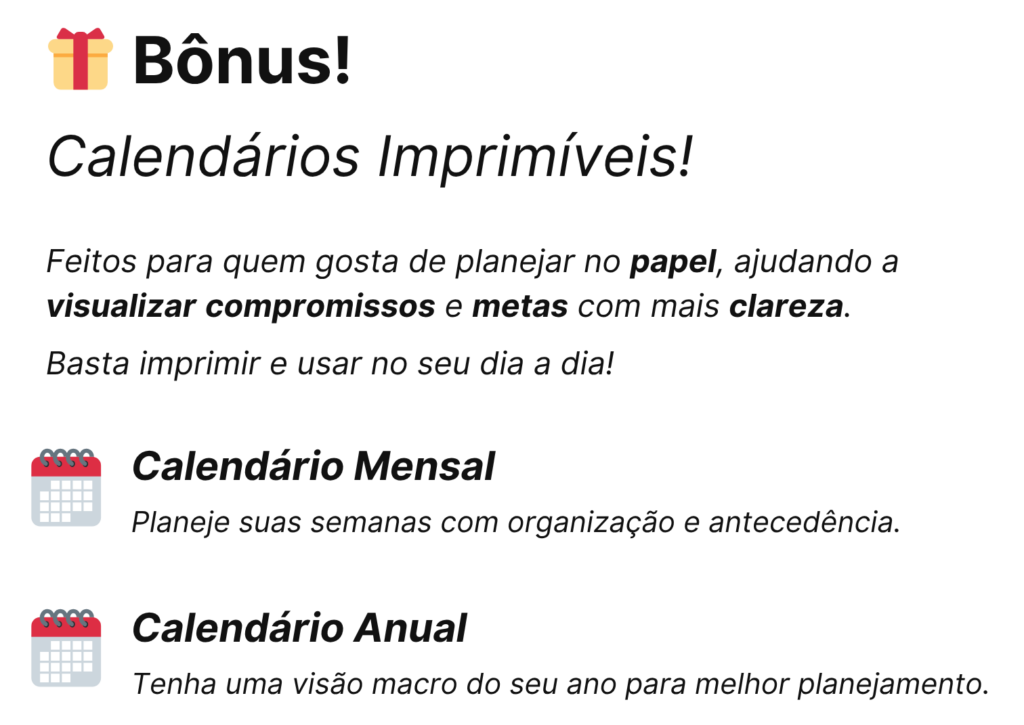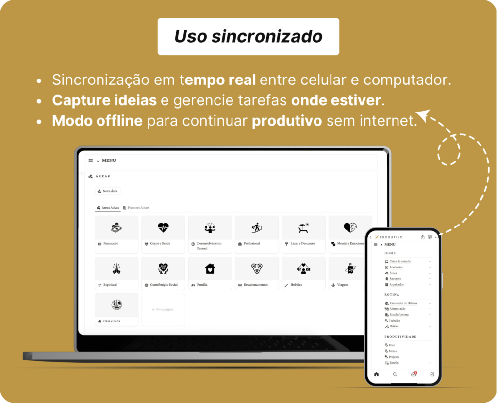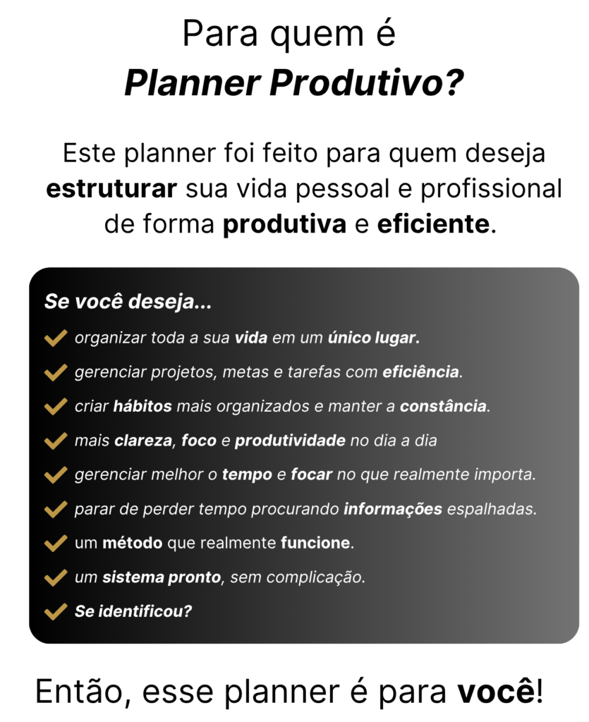 O Planner Produtivo é um sistema inteligente e completo, baseado em um método próprio que conecta todas as áreas da vida. Ele foi criado para gerar ação real, com aulas práticas, trilha de implementação e suporte dedicado para te acompanhar na jornada.