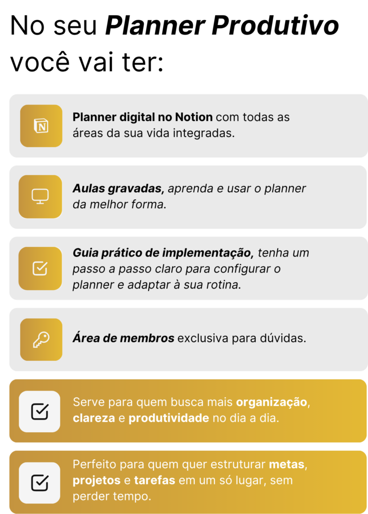 O Planner Produtivo é super intuitivo, e nas aulas você aprenderá passo a passo tudo o que precisa saber para começar, mesmo que nunca tenha usado o Notion antes.