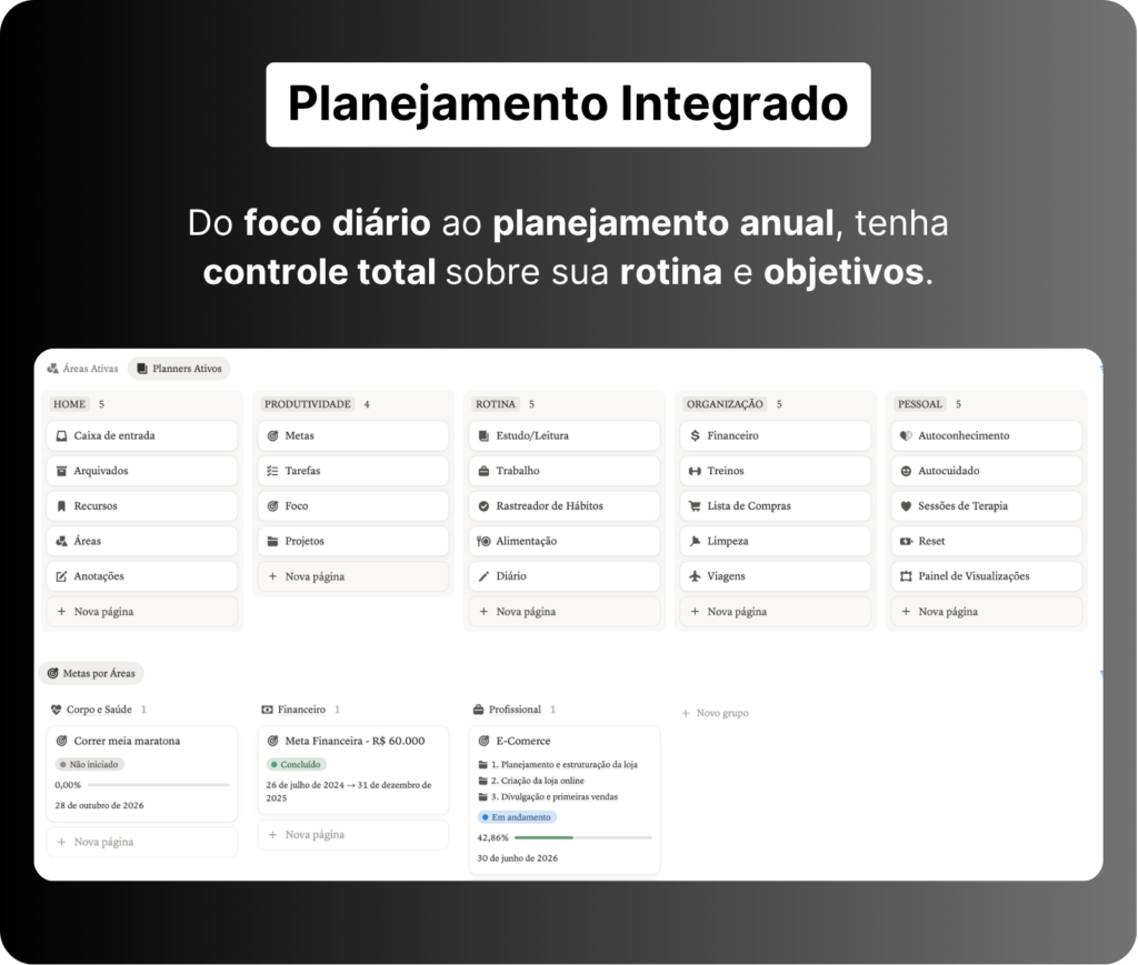Sempre acreditei que organização e autoconhecimento são alavancas de performance. Buscando um jeito de centralizar tudo em um único sistema, ágil e inteligente, criei o Planner Produtivo, uma metodologia prática para transformar intenção em resultado.